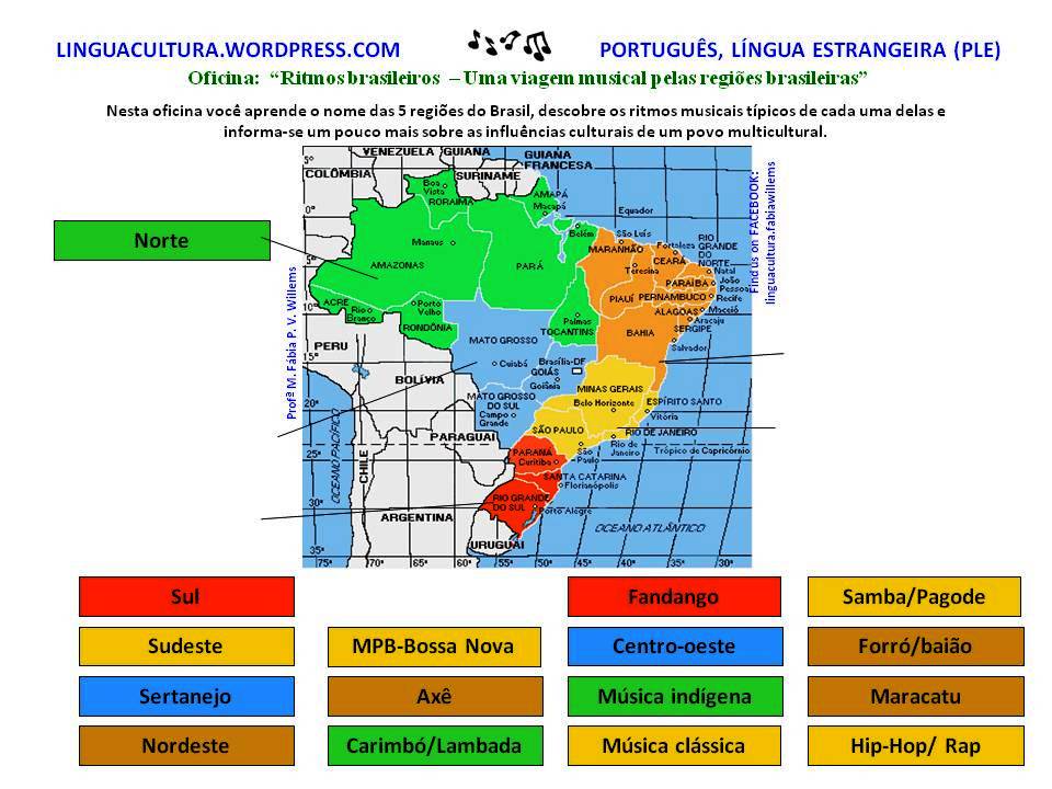 MPB (Música popular Brasileira): http://www.youtube.com/watch?v=8sIBMafJ42s - Reportagem sobre a história da MPB (15:16) Samba: http://www.youtube.com/watch?v=-XPFQIrdAL4 - Pelo Telefone - Chico Buarque, Donga, Pixinguinha e Hebe (01:59) Bossa Nova: http://youtube.com/watch?v=DmV0TcTNJ3o - Garota de Ipanema, cantada por Tom Jobim (4:08) Jovem Guarda: http://www.youtube.com/watch?v=-pNPZ-crmdQ - Paulo Sérgio - A última canção - (03:31) http://www.youtube.com/watch?v=hlkBrbVfmlk - Roberto Carlos (& Paula Fernandes)- Eu te darei o céu - (00:47) HipHop/Rap: http://www.dailymotion.com/video/x1tj8p_cabal-mexe-seu-corpo_music - Mexe seu corpo,Cabal (4:08) Rock: http://www.youtube.com/watch?v=kPpPFhPwFvM - Vou deixar, Skank (3:25) Fandango: http://www.youtube.com/watch?v=g69ZAQbsFgw - CTG Aldeia dos Anjos (01:47) Sertanejo: http://www.youtube.com/watch?v=0DH3OvmonT8 - Coração Sertanejo, Chitãozinho e Xororó (3.41) Forró: http://www.youtube.com/watch?v=bv4r3SijCbI&feature=related (4:27) Axé: http://www.youtube.com/watch?v=XuMXy20Ai9M (4.25) Frevo: http://www.youtube.com/watch?v=lGGE_qXqeao&feature=related - Reportagem (4:25) http://www.youtube.com/watch?gl=BR&hl=pt&v=Zd1_ZCDi1W8 - História do Frevo (2:43) Música indígena: http://br.youtube.com/watch?v=dt7zVIHHJqY - Reportagem (4:28) Música da Amazônia: http://www.youtube.com/watch?v=BDufvphW5JE&feature=related (3:36) Música Clássica Brasileira: http://www.youtube.com/watch?v=UMkLchCMNfo - O Guarani (abertura) / Maestro Goethe PART I (4:39)
