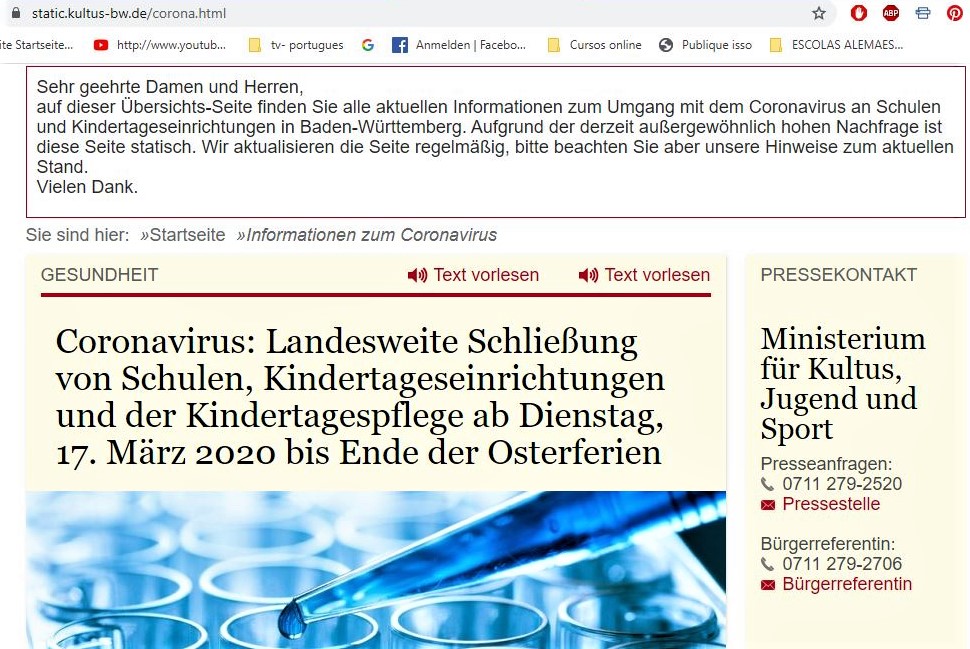 Aqui na minha cidade, a notícia chegou ontem. Stuttgart é a capital de Baden-Württemberg e demorou para tomar esta decisão radical. Começaram a reunião decisiva às 9 horas, o que atrasou o envio dos oficios às escolas e creches. Agora, tem aula sim na segunda-feira! Os professores de todas as escolas públicas e particulares terão que informar aos pais e aos alunos o motivo do fechamento e explicar as tarefas que deverão fazer em casa.