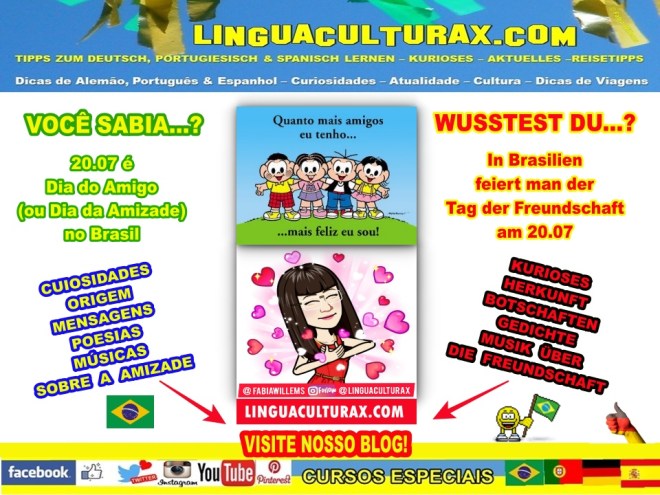 Descubra algumas curiosidades, Mensagens, Poesias & Músicas sobre o Dia do Amigo no Brasil no post de hoje! Um especial muito bom também para quem aprende Português, como Língua Estrangeira ou alemão, pois há em baixo dos dois últimos vídeos exercícios extras!