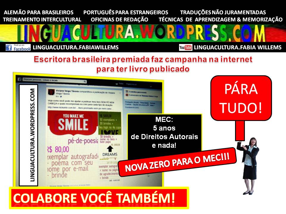 Por: M. Fábia P. V. Willems Escritora brasileira premiada faz campanha na internet para ter livro publicado „Um país se faz com homens e livros“ (Monteiro Lobato) Ter seu primeiro livro publicado, este é o sonho de Viviane Veiga Távora. A poetisa brasileira de Limeriques já teve alguns livros publicados, mas seu xodó, o SEM PÉ“Escritora„Escritora brasileira premiada faz campanha na internet para poder publicar seu livro“ weiterlesen