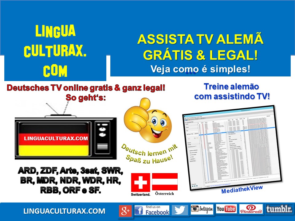 Por M. Fábia P. V. Willems Como assistir TV alemã gratuitamente e totalmente legal? Aproveitando a oportunidade oferecida pelas tvs alemãs na internet. Use a internet para se divertir, mas também aproveite-a para desvendar os segredos da língua alemã e aprender mais sobre a cultura da Alemanha, Áustria e Suíça. A programação oferecida pelos canais“Como„Como assistir TV em alemão grátis & legal – Turbine seu alemão! (TV im Deutsch via Internet schauen & dazu Deutsch lernen – so geht’s)“ weiterlesen