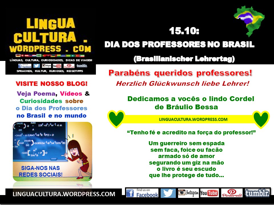 Por: M. Fábia P. V. Willems Parabéns aos nossos queridos professores! Neste dia especial, homenageamos este profissional que dedica sua vida a colaborar com o desenvolvimento intelectual e humano de crianças, jovens e adultos deste país. Também segue um abraço para aqueles que vivem fora do Brasil, mas que levam, além da saudade no peito, nossa“15.10:„15.10: Dia dos Professores no Brasil – Origem, Curiosidades, Poemas e Filme (Lehrertag in Brasilien: Herkunft, Kurioses, Gedichte & Filme)“ weiterlesen