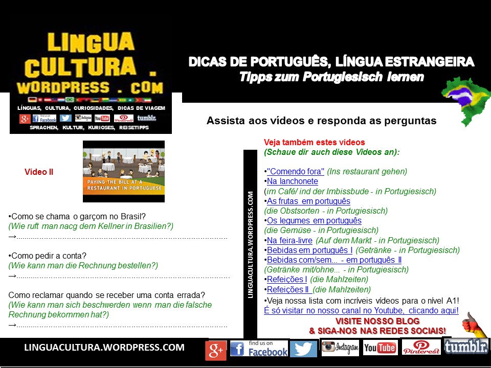 Olá! Tudo bem? Hoje vamos ao restaurante. Você vai aprender como se comportar nesta situação e como pode fazer seus pedidos. Assista aos vídeos e depois responda as perguntas logo abaixo. Boa sorte! Hallo! Wie gehts? Heute gehen wir ins Restaurant. Du lernst, wie du dich im Restaurant benehmen sollst und deine Bestellungen“Dicas„Dicas de Português, Língua Estrangeria(PLE)-A1: No restaurante – Portugiesisch für Anfänger: Im Restaurant“ weiterlesen